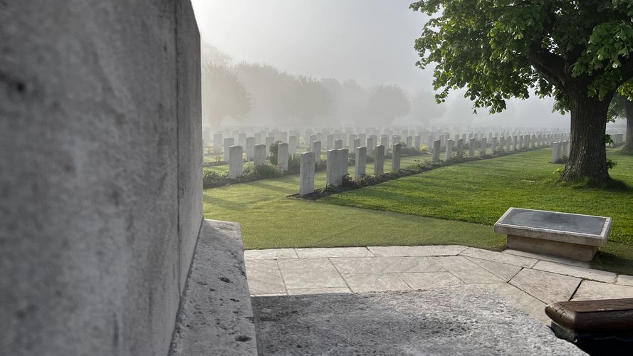A misty morning at Essex Farm Cemetery in Ypres, Belgium.